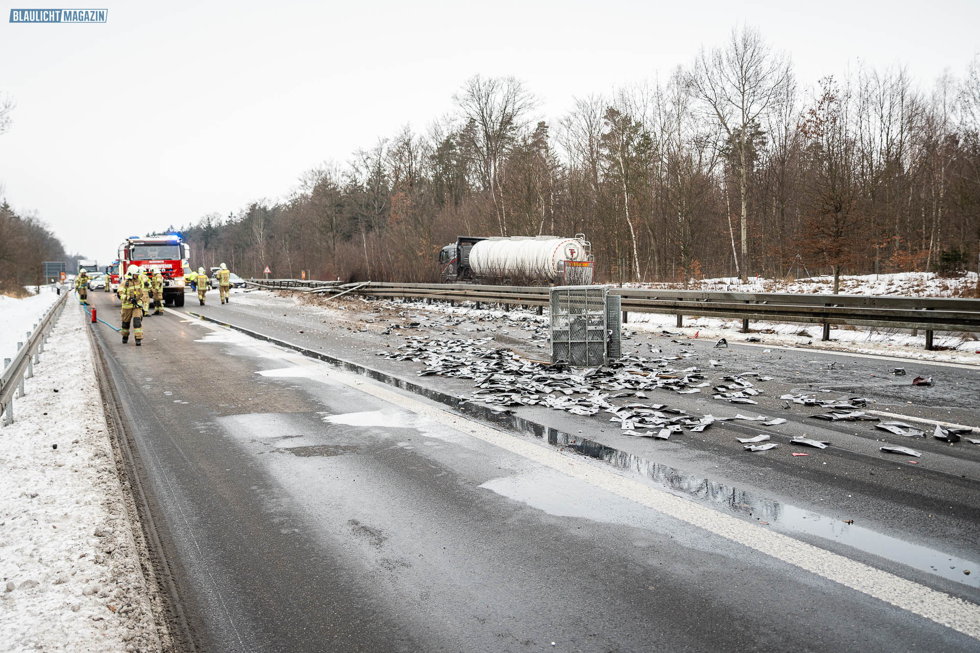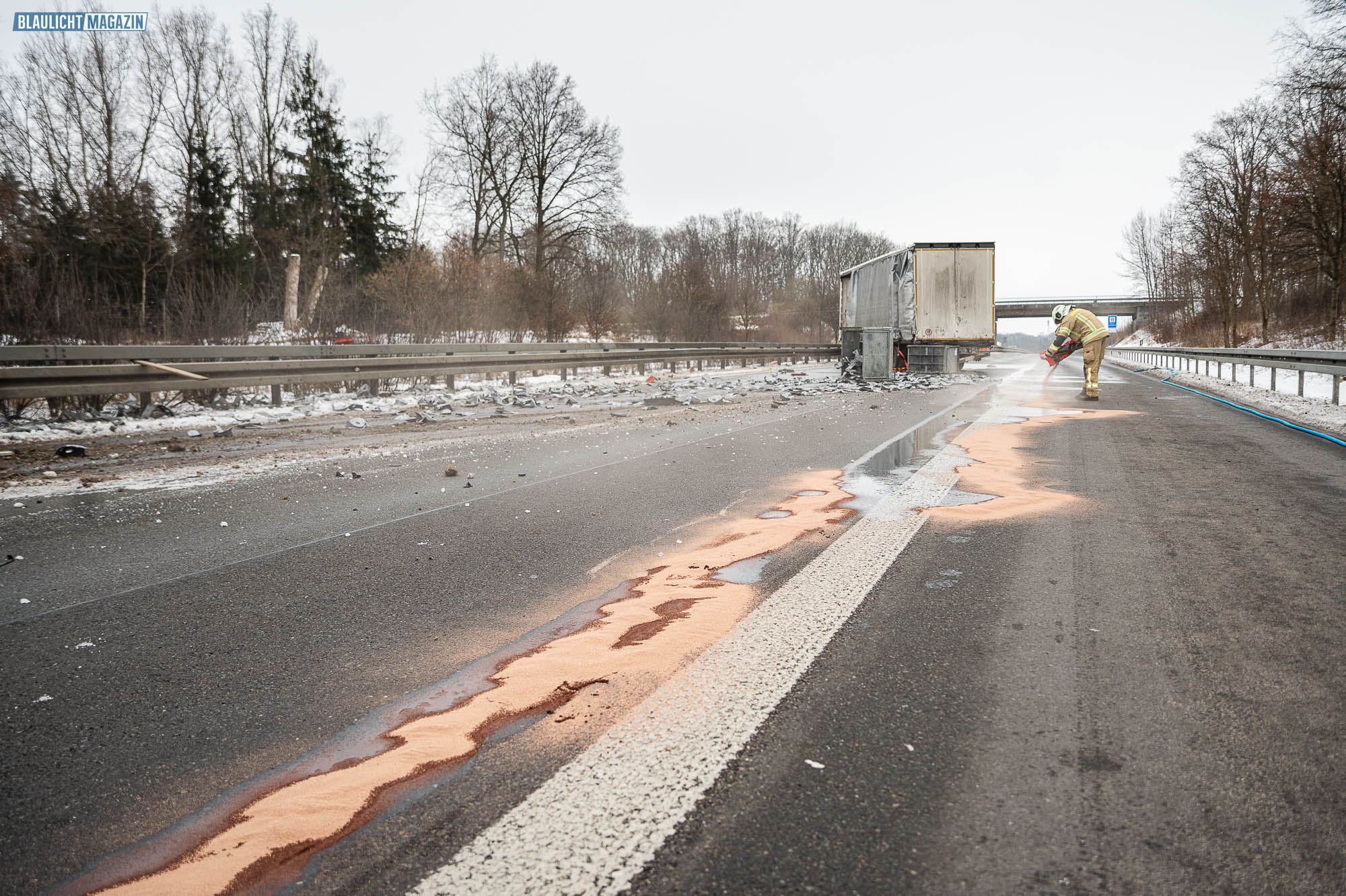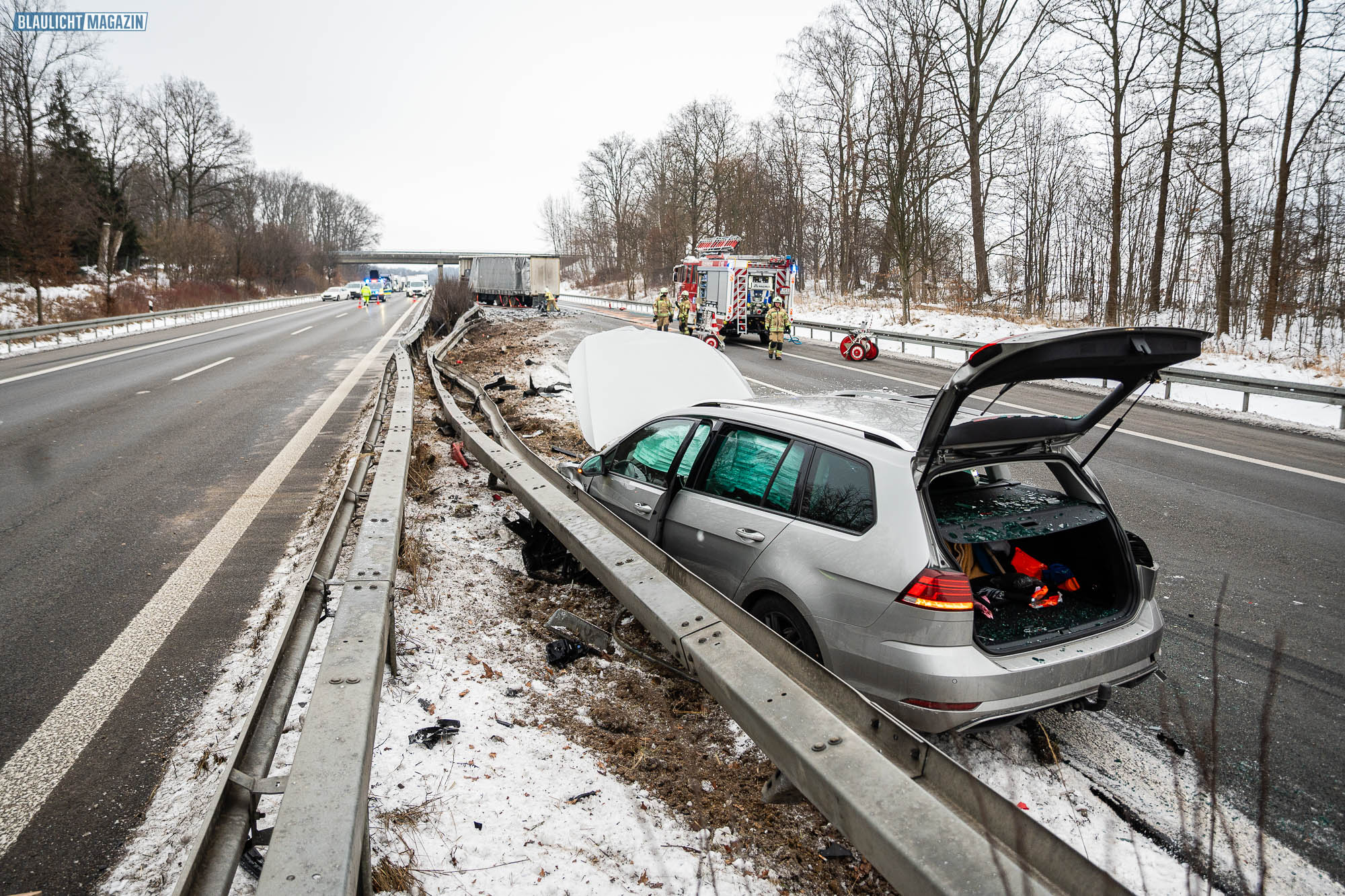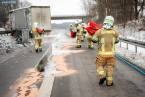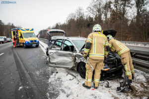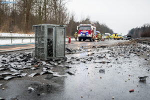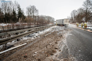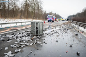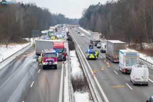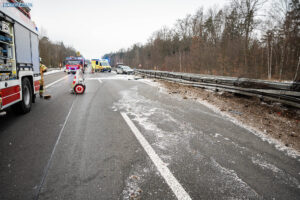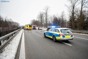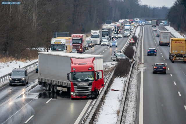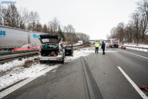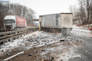 Ein Unfall mit Folgen hat sich am Donnerstagnachmittag auf der A4 bei Pulsnitz ereignet. Aus bisher ungeklärter Ursache stieß ein PKW in Fahrtrichtung Görlitz mit einem LKW zusammen. Durch die Wucht des Aufpralls wurde der PKW in die Mittelschutzplanke gedrückt, am LKW wurde der Abflieger aufgerissen, Ladung verteilte sich auf der Fahrbahn und der Dieseltank wurde beschädigt. Der LKW kam quer auf beiden Spuren zum Stehen. Die beiden Fahrzeugführer wurden durch den Unfall leicht verletzt. Der Rettungsdienst versorgte die Männer.