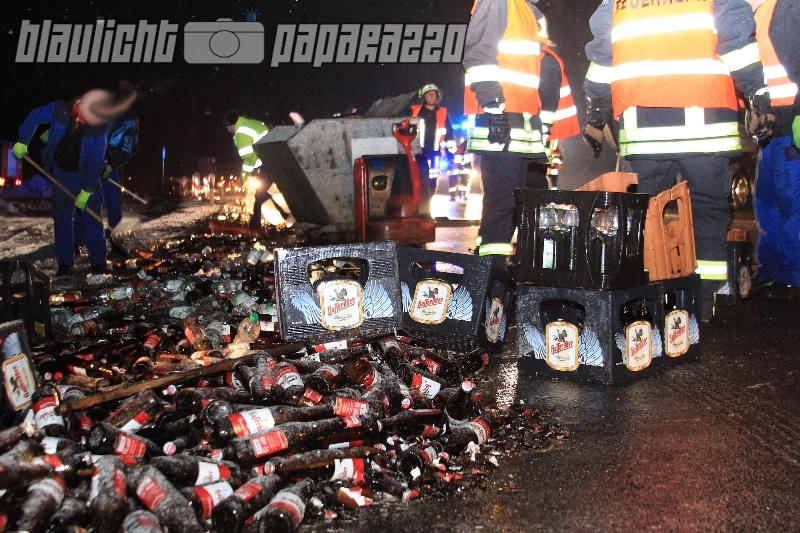 Schade drum! Ein Bierlaster hat am frühen Montag Morgen seine Ladung auf der B96 bei Neschwitz im Kreis Bautzen verteilt. Der LKW war zwischen Luga und Holscha unterwegs, als in einer Kuve aus ungeklärter Ursache die Plane des Anhängers aufging und dutzende Bierkästen auf die Fahrbahn fielen. Hunderten Liter der wertvollen Fracht verteilten sich auf dem Asphalt, die Feuerwehr musste anrücken, um die Scherben zu beseitigen. Anschließend kam Verstärkung aus dem Getränkehandel zu Hilfe, um die Kästen und unbeschädigten Flaschen einzusammeln. Währenddessen war die B96 vollständig gesperrt, es bildete sich ein kilometerlanger Rückstau. Wie es genau zu dem Vorfall kommen konnte ist noch unklar.